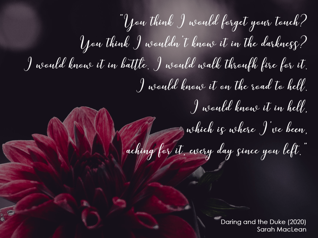 However, as much as I enjoyed Daring and the Duke, I kept expecting just a bit more. A bit more revenge. A bit more plot. A bit more than just the romance. There were multiple opportunities to expand on interesting points, but they don’t pan out to very much. The book mentions parliamentary votes, conspiratorial women, and even raids, but it doesn’t really go beyond this. The description promises revenge, but I didn’t get the revenge I was hoping for. The only real revenge from Grace is at the beginning, while the rest of the book is more about their struggle to control their feelings and define what they might still be to each other. Also, I just really wanted Ewan to experience more pain for all the heartache he caused.