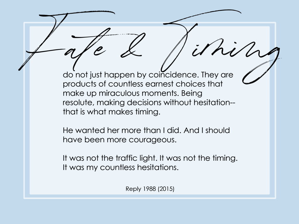 Reply 1988 (2015) is one of my favorite Korean dramas. Although the third installment of the nostalgic series, it’s also arguably the best of the three. The emphasis on familial bonds and friendship made this a staple of my 2015 and subsequent years after–I watched it repeatedly but it offered comfort as background noise as well. From time to time, I often recall this quote as one character found love and the other lost it. I hate love triangles…I always seem to be on the losing side. What is fate and timing but a product of our choices?