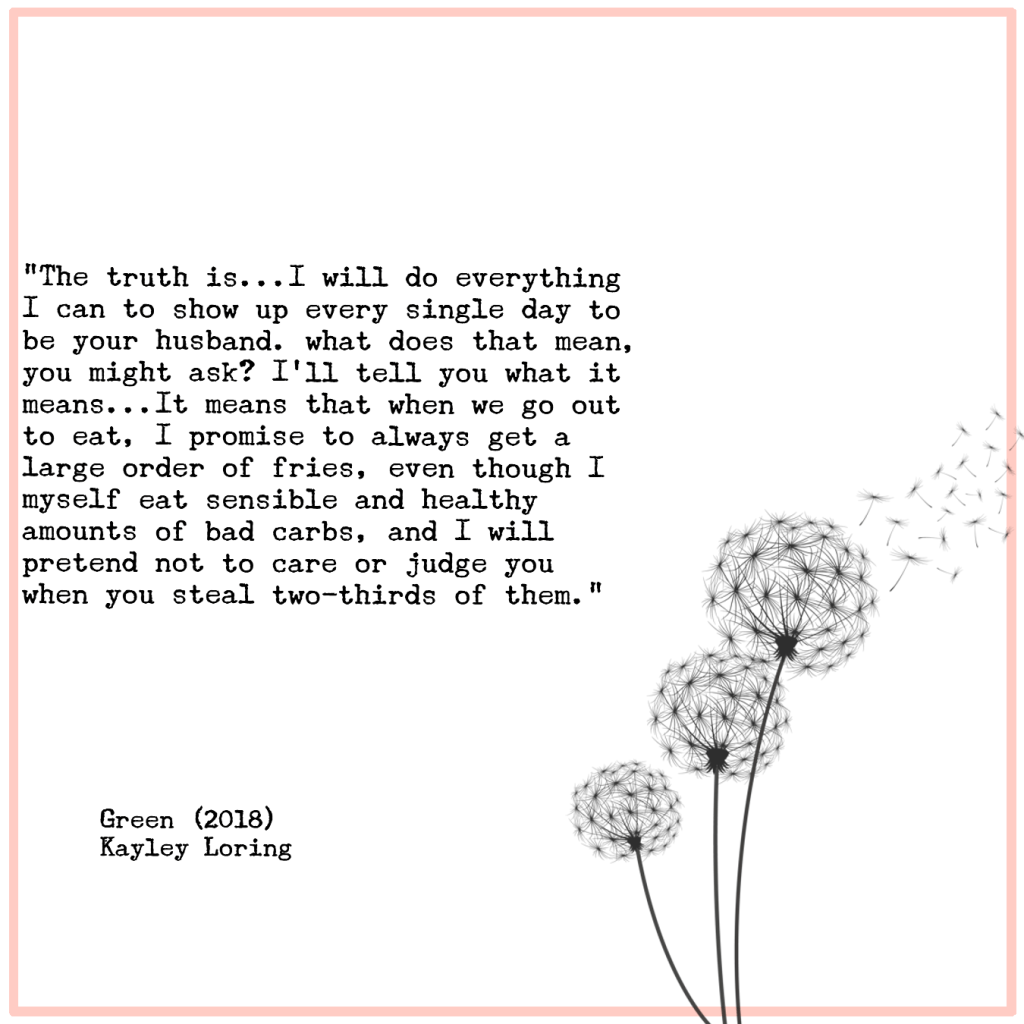 Love isn’t just the grand gestures. It’s also the little things. Green (2018) is probably my favorite book from Kayley Loring. Best friends Theo and Gemma get married so that he can stay in the United States and this is his vow. It’s pretty obvious they’re already in love with each other, but she doesn’t realize it yet. This is part of his vow to her and it was perfect.
