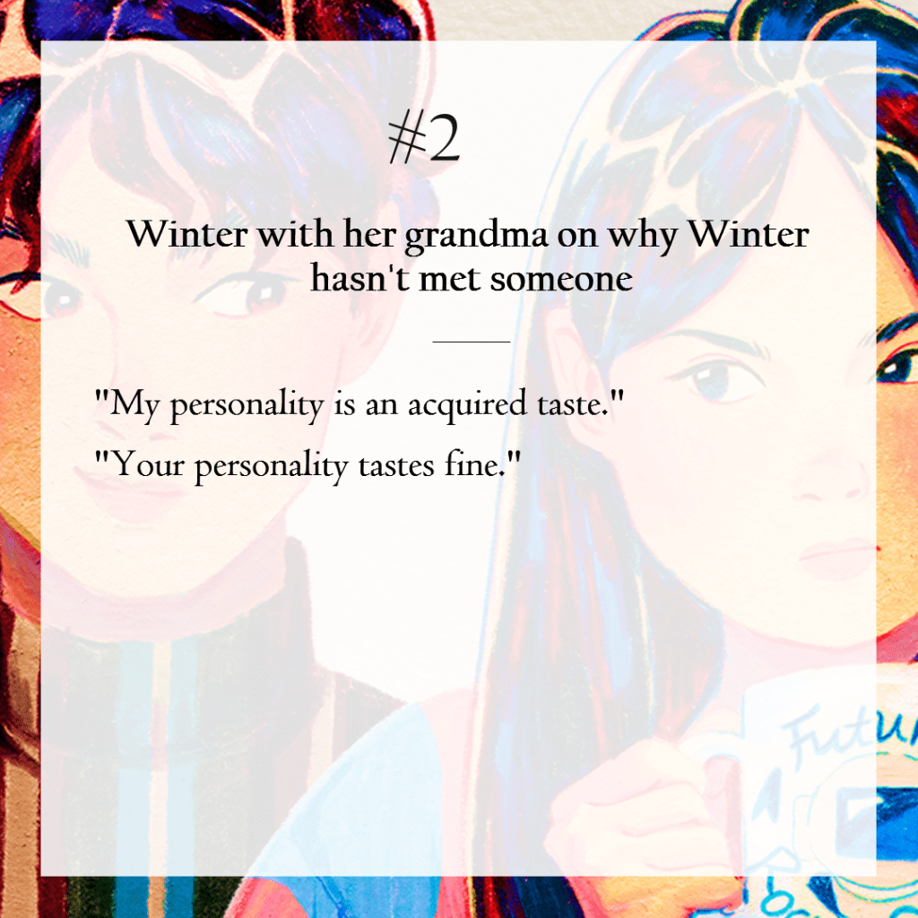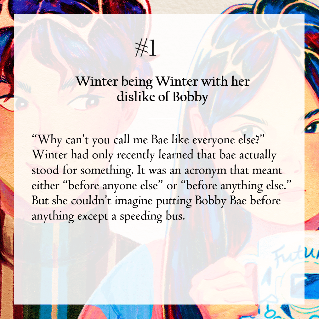 Winter is MIT-bound, comfortable keeping people at arm’s length, and known by others as responsible, though she has a desire to let loose. This probably comes from her rebel grandmother, who is constantly pushing boundaries and encouraging Winter to do so as well. Winter’s best friend is moving abroad and won’t be attending college at all, and Winter’s wrestling with what it means to be left behind. Bobby is as Type-A, anxious, and risk-averse as you can get. He’s also been recently dumped, which has him feeling disoriented and untethered.